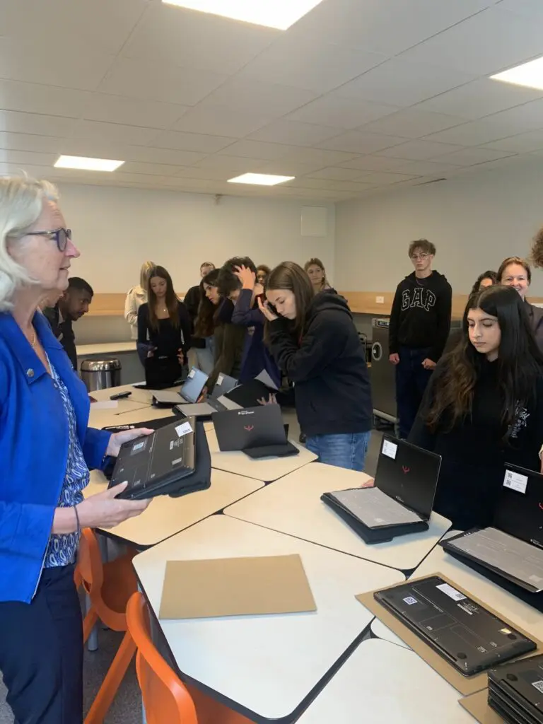Mme Habert-Dupuis, première adjointe au Maire en charge de l’éducation et conseillère régionale, a eu le plaisir de remettre en personne un ordinateur à chaque lycéen, accompagnée par La Poste, engagée avec bienveillance dans l’inclusion numérique. Un atout précieux pour la réussite de nos jeunes .