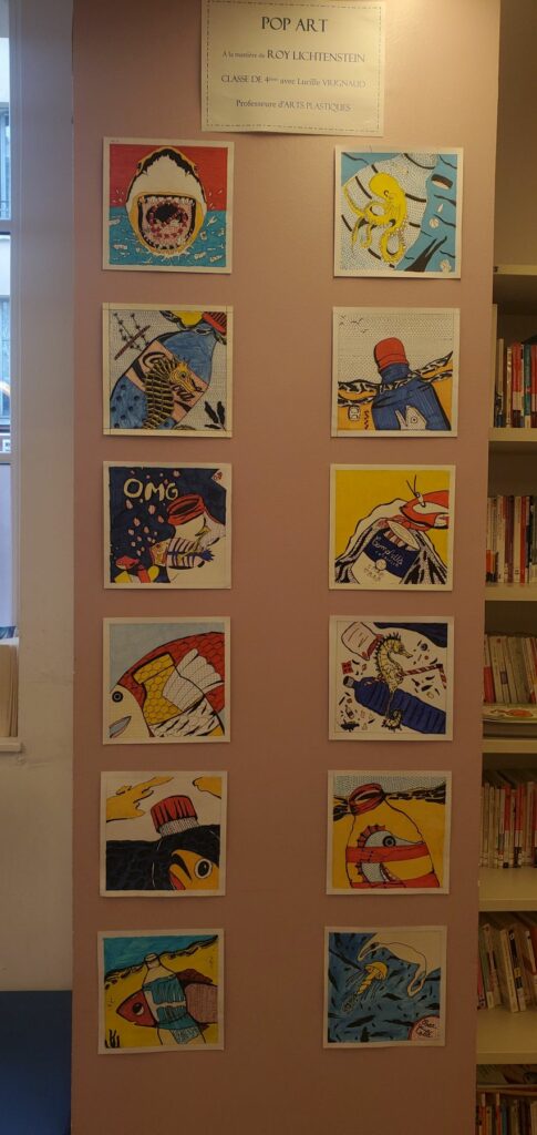 Les 4èmes, quant à eux, ont composé à la manière de Roy Lichtenstein des dessins pour alerter au sujet de la pollution marine. Beaucoup d’inventivité et de très belles réalisations !