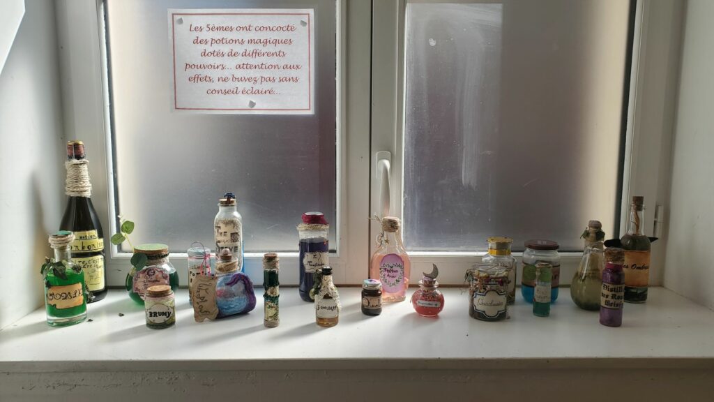 Les 5èmes ont concocté des potions magiques et imaginé des flacons aussi extraordinaires que les pouvoirs des breuvages qu’ils contiennent !