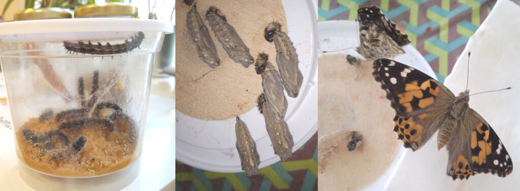 Nous avons pu observer en classe la transformation de chenilles en papillons ! Nous avons commandé des chenilles, elles sont arrivées dans un bocal avec toute la nourriture dont elles avaient besoin sous forme de pâte sucrée au fond du pot. Nous les avons regardé grandir puis s’enfermer dans leur chrysalide… et en ressortir, une semaine après, en papillon !