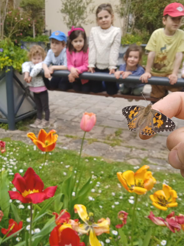 Nous avons pu garder les papillons quelques jours en les nourrissant avec des mandarines coupées en deux et de la banane écrasée, puis les papillons ont été libérés, les plus pressés de découvrir le monde extérieur ont été relâchés au parc du château par la classe de CP lors de leur trajet vers la piscine et les derniers papillons ont été libérés dans la cour d’honneur de l’école, bien fleurie en cette saison.