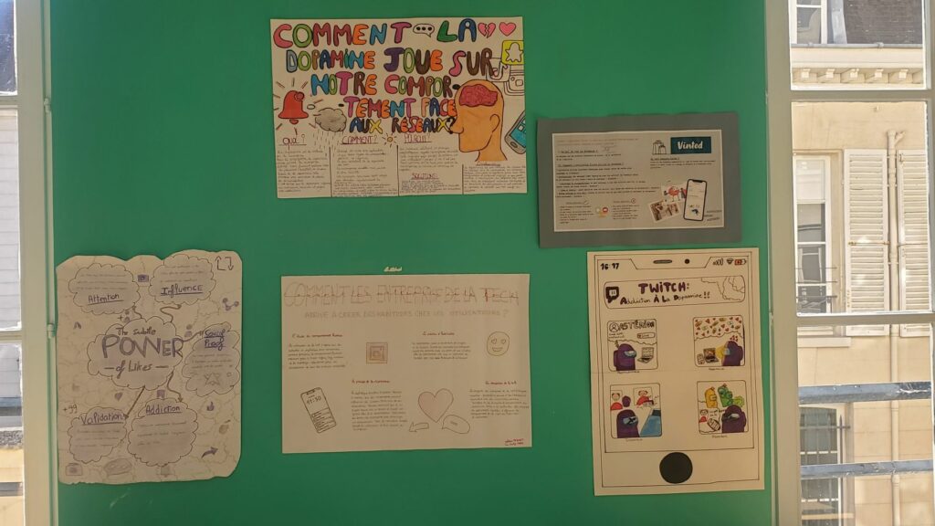 Après avoir analysé des extraits de vidéo sur la manière dont les applications piègent notre cerveau, les élèves ont réalisé des affiches exposées en salle de permanence.